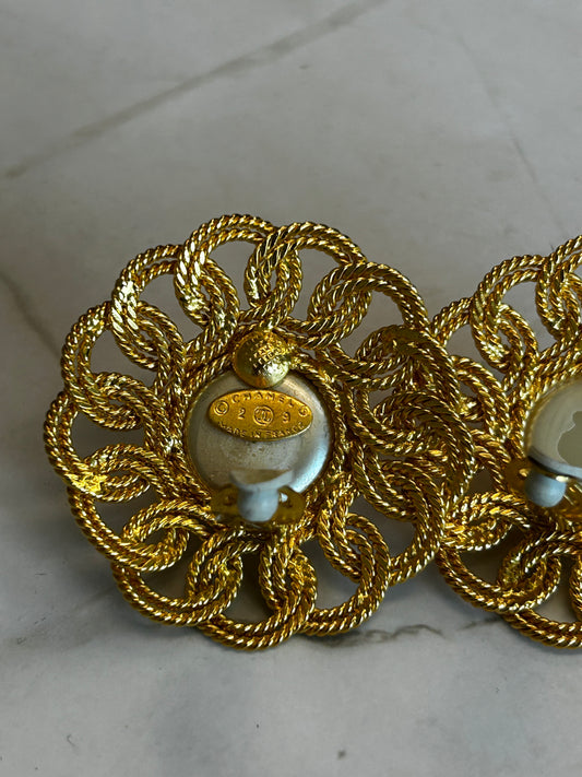 CHANEL GOLD TWISTED METAL AND FAUX WHITE BEADS CLIP ON EARRINGS 1990
