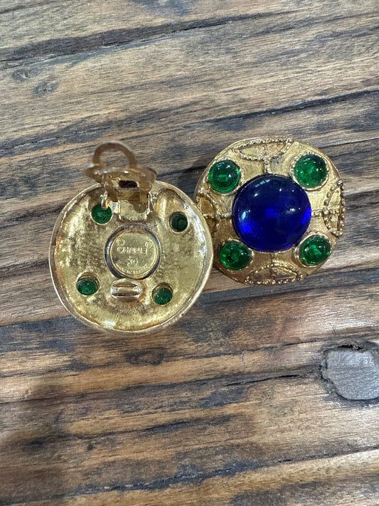CHANEL Green & Blue Gripoix Gold Plated Paris Maison Clip On Earrings 1980's